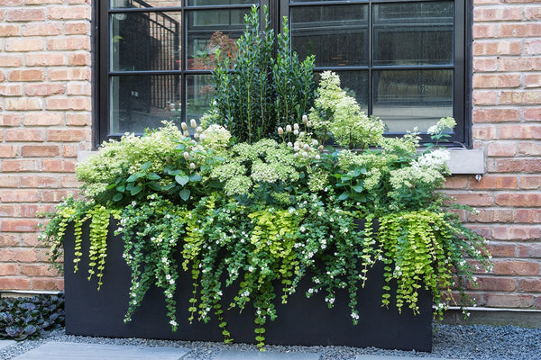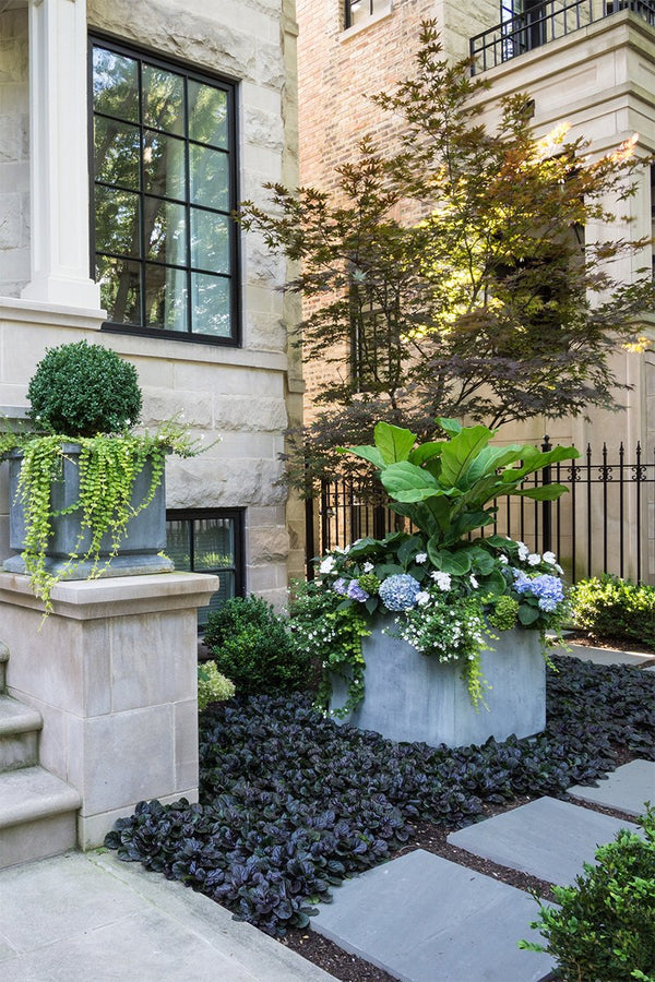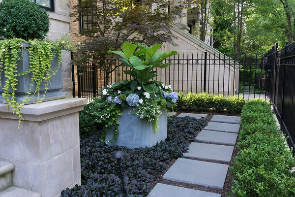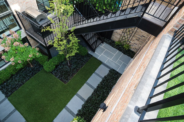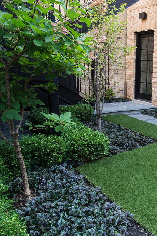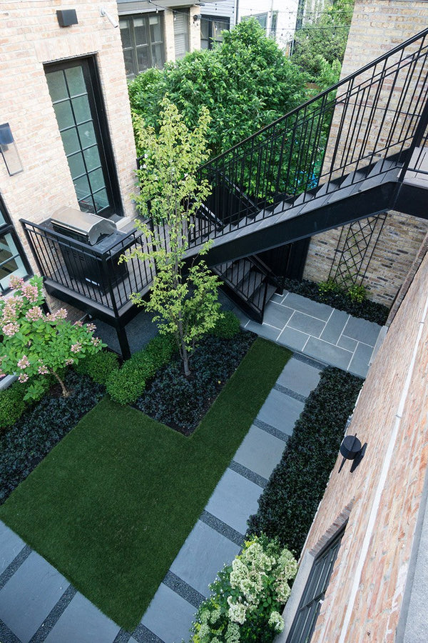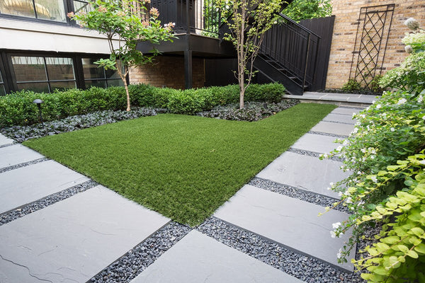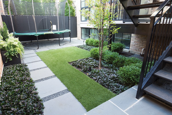 The previous back yard landscape was mostly lawn, which quickly turned to mud when the children played on it. The new artificial turf and bluestone steppers provide a clean playing surface. A low maintenance landscape was important to the homeowner's and a simplified planting scheme compliments the home while achieving that goal