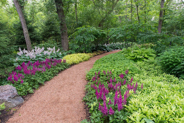 In 2009 the back wooded area of the property was overgrown and full of buckthorn. The client was interested in reclaiming the area and making it a beautiful addition to the rest of the property. A landscape plan was developed to include gravel walking paths, extensive perennial beds, and stone lined swales to address storm water moving through the site.