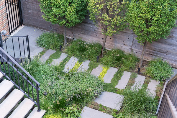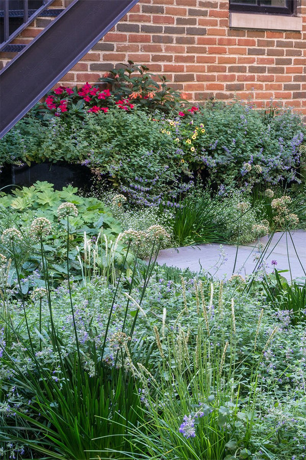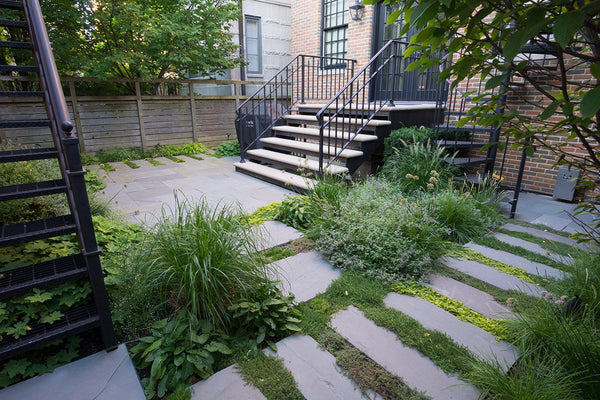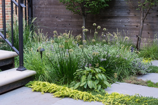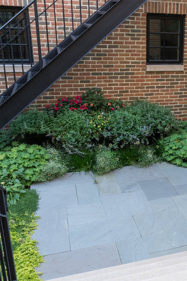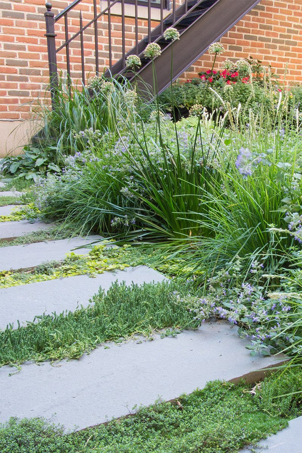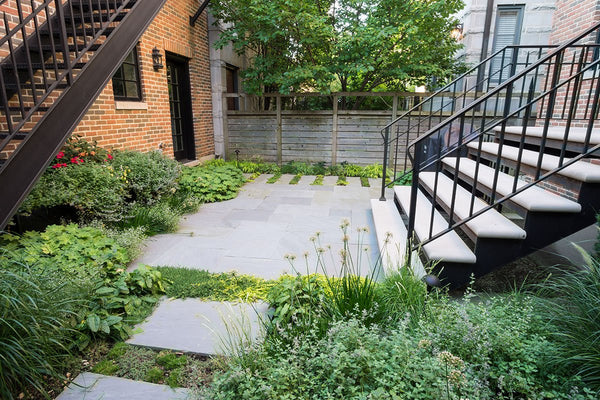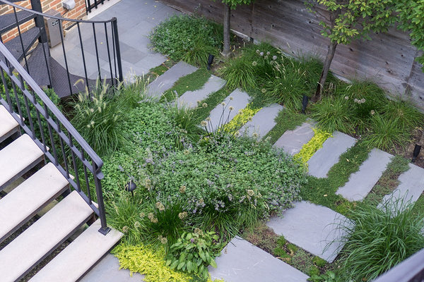 Once the backyard was cleared, the new patio spaces were defined and the crew began to install custom cut bluestone. A bluestone patio was centered on the space and allows the homeowners to access the grill and entertain small groups. Connection to the garage, service area, side yard walk, and stairs leading to the garage roof deck are all created with bluestone stepper pathways. Between the stone steppers, low spreading plants such as thyme and creeping jenny fill the gaps. The garden beds are filled with a mix of flowering allium, catmint, salvia, and ornamental grasses.