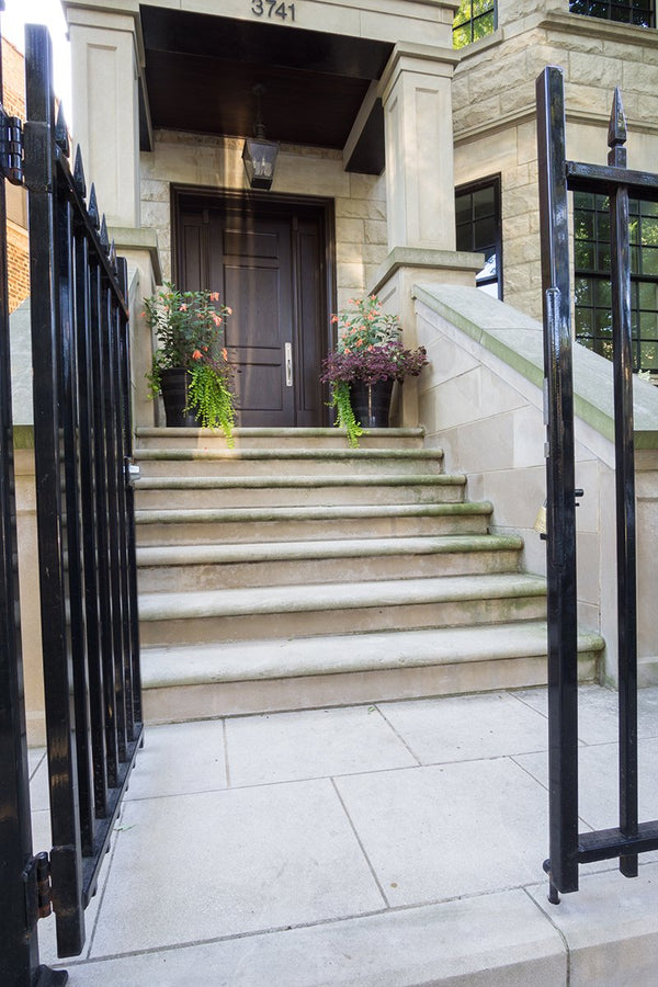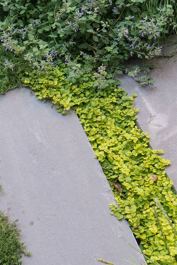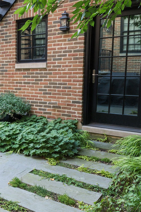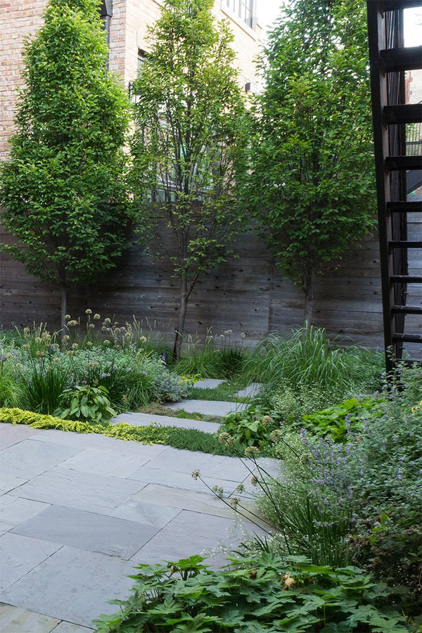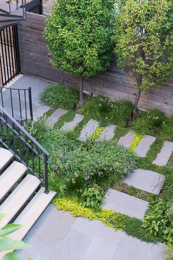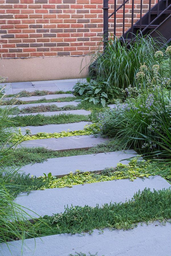 Once the backyard was cleared, the new patio spaces were defined and the crew began to install custom cut bluestone. A bluestone patio was centered on the space and allows the homeowners to access the grill and entertain small groups. Connection to the garage, service area, side yard walk, and stairs leading to the garage roof deck are all created with bluestone stepper pathways. Between the stone steppers, low spreading plants such as thyme and creeping jenny fill the gaps. The garden beds are filled with a mix of flowering allium, catmint, salvia, and ornamental grasses.